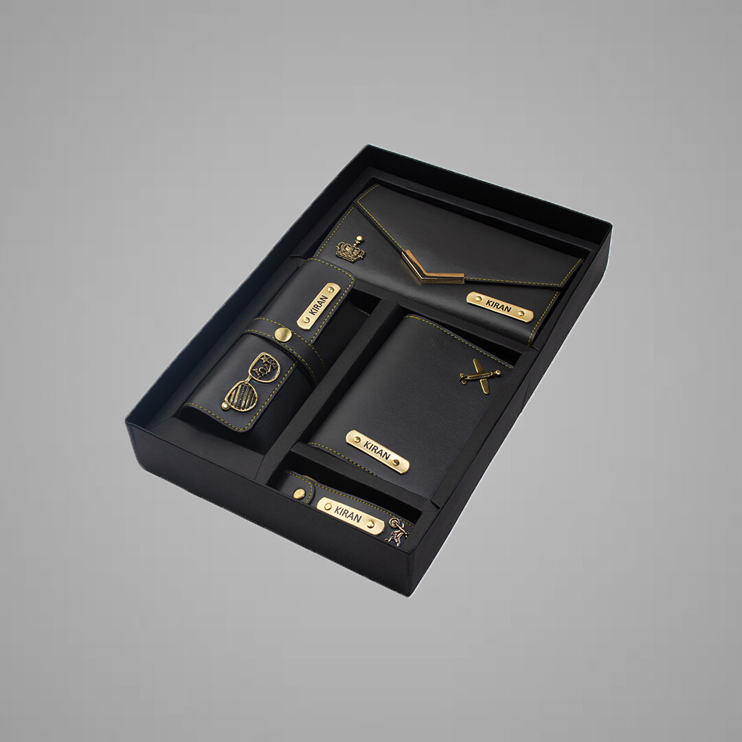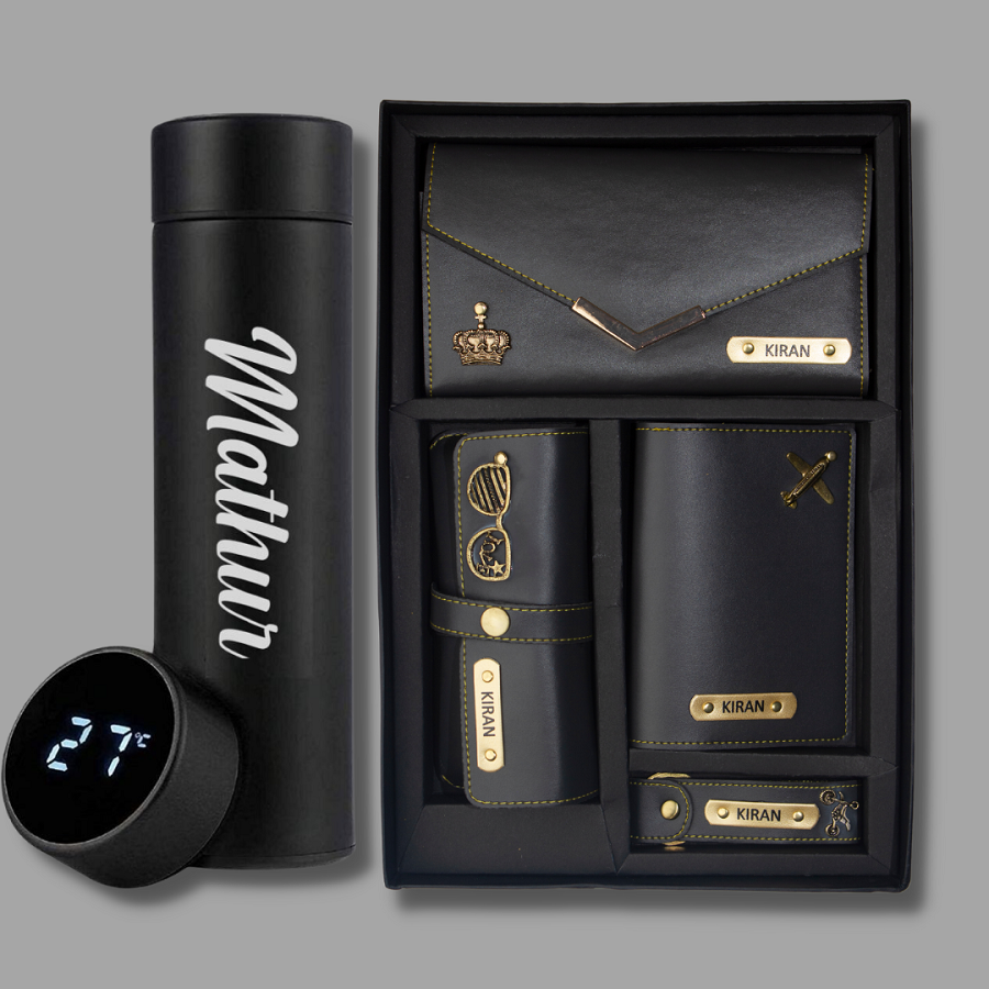 Womens Combo Black (Customised Wallet, Glasses Case, Passport Cover, Keychain, Temperature Bottle)